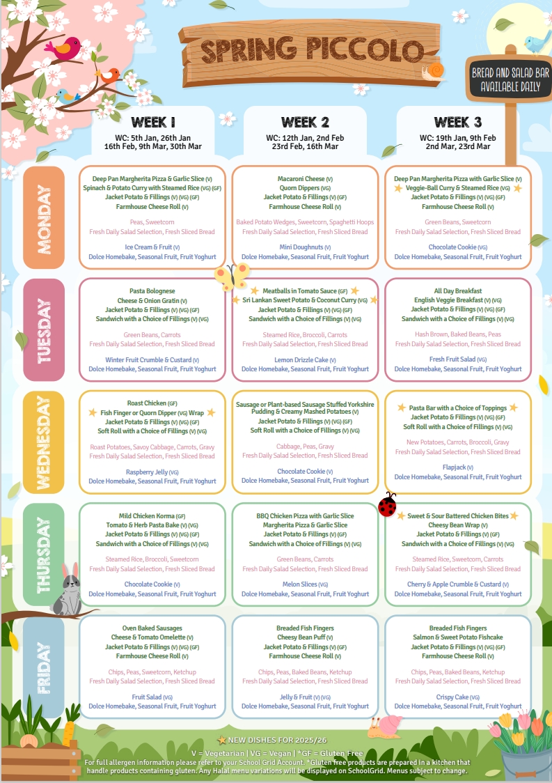 Please note all children in Reception, Year 1 and Year 2 receive Free School Meals, so please do not pay for these on school grid or Parent Pay.